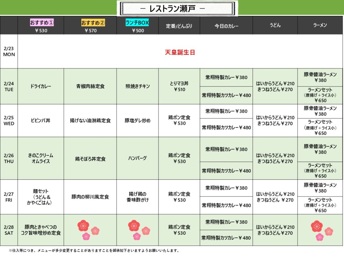 【広国大】呉: レストラン瀬戸 2月23日からの1週間メニュー