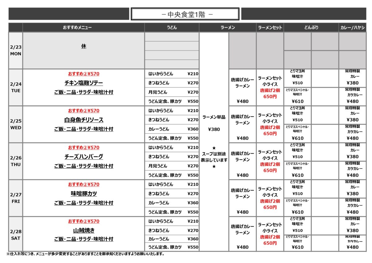 【大工大】大宮:中央食堂1階 2月23日からの1週間メニュー