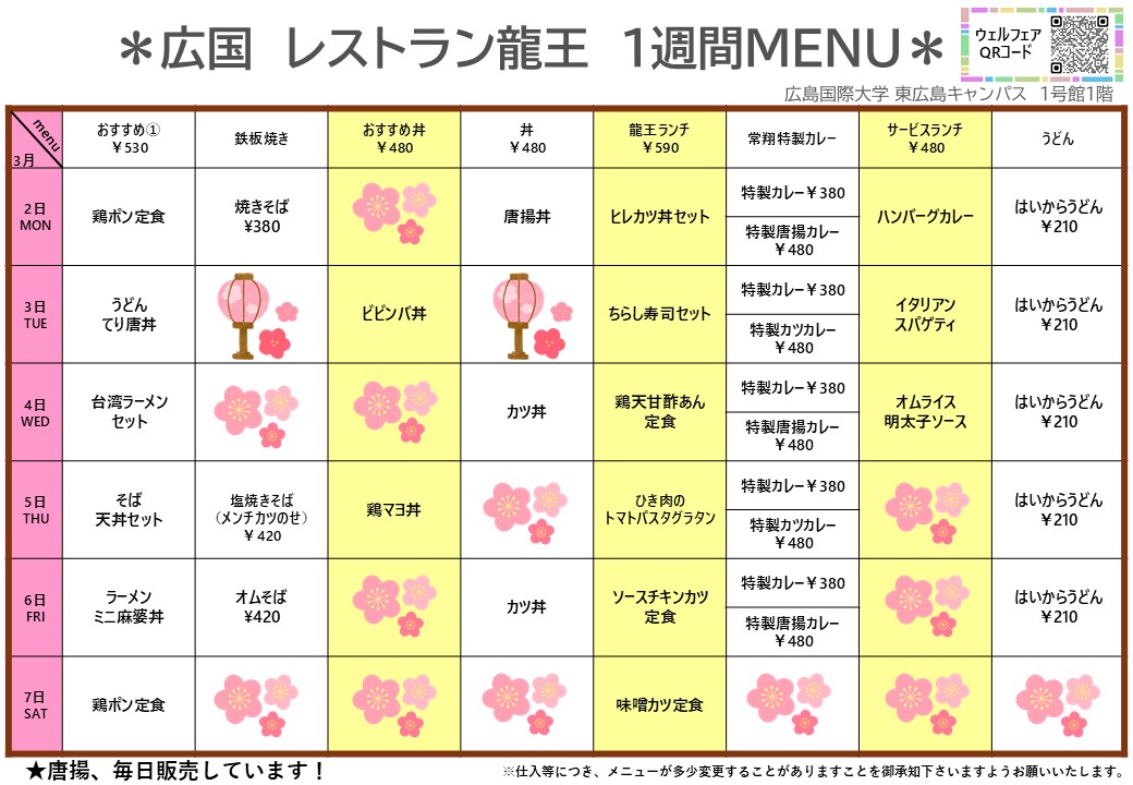 【広国大】東広島:レストラン龍王 3月2日からの1週間メニュー