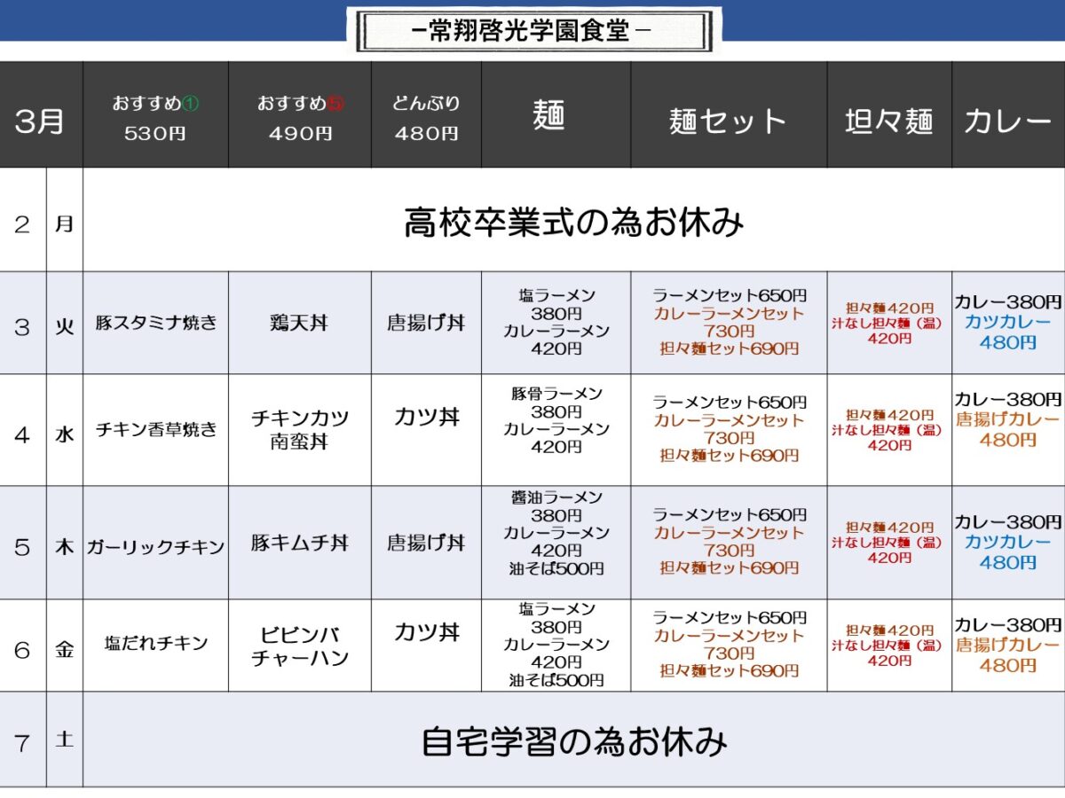 【常翔啓光中・高】啓光学園食堂 3月2日からの1週間メニュー