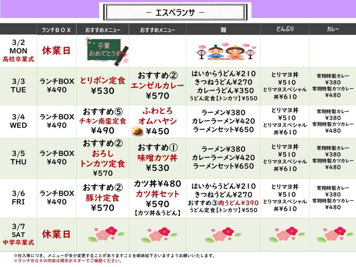 【常翔学園中・高】エスペランサ 3月2日からの1週間メニュー