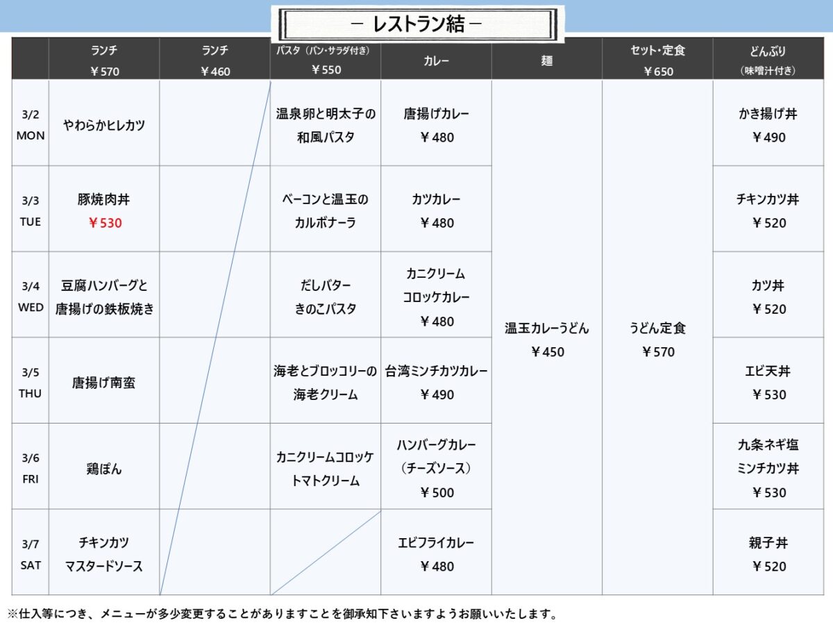 【摂南大】枚方:レストラン結 3月2日からの1週間メニュー