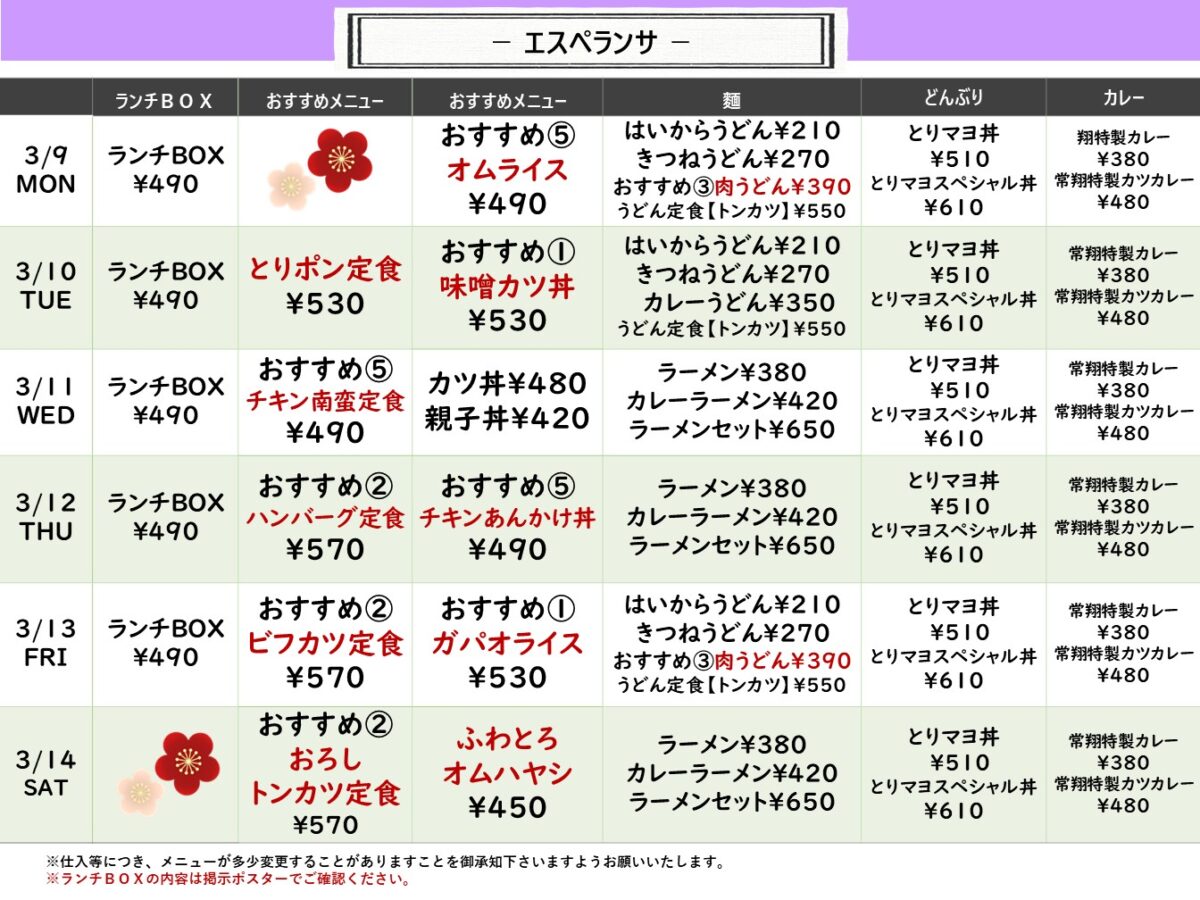 【常翔学園中・高】エスペランサ 3月9日からの1週間メニュー