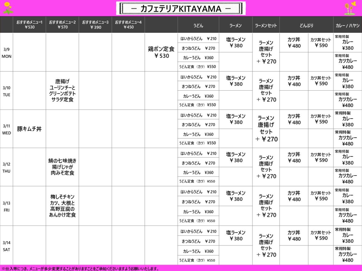 【工大】枚方:カフェテリアKITAYAMA 3月9日からの1週間メニュー