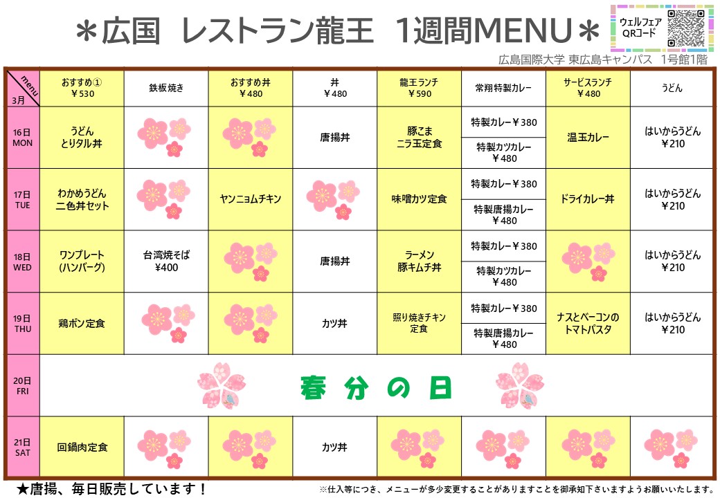 【広国大】東広島:レストラン龍王 3月16日からの1週間メニュー