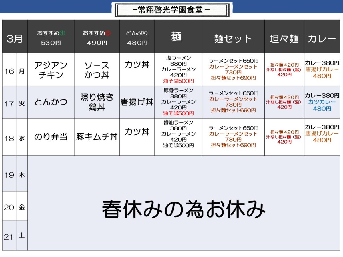 【常翔啓光中・高】啓光学園食堂 3月16日からの1週間メニュー