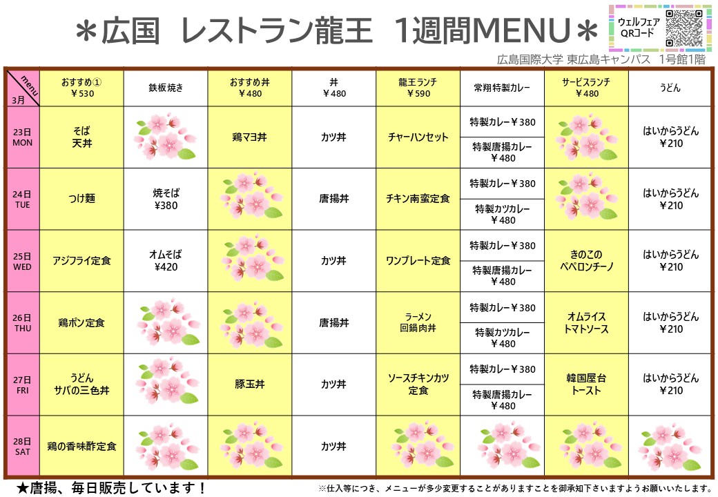 【広国大】東広島:レストラン龍王 3月23日からの1週間メニュー