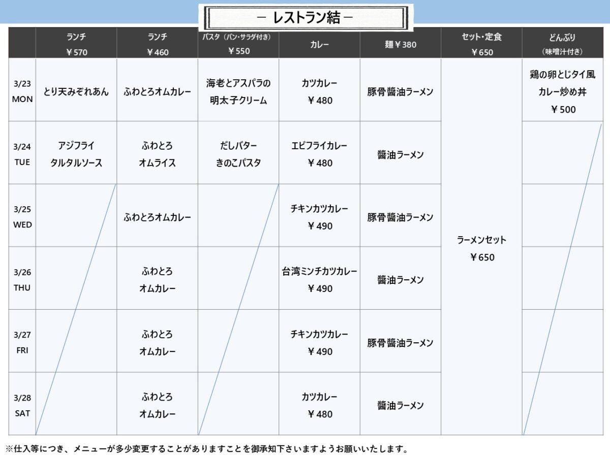 【摂南大】枚方:レストラン結 3月23日からの1週間メニュー