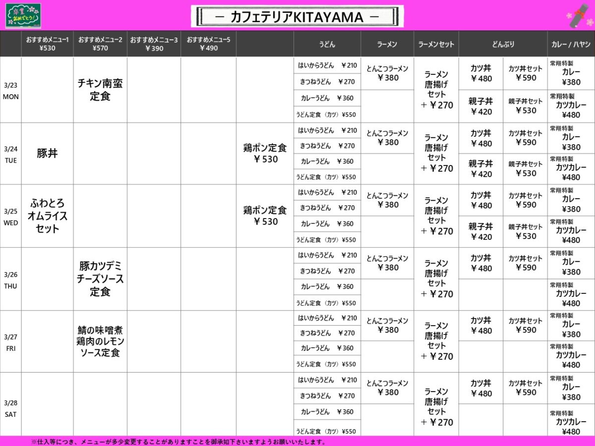 【工大】枚方:カフェテリアKITAYAMA 3月23日からの1週間メニュー