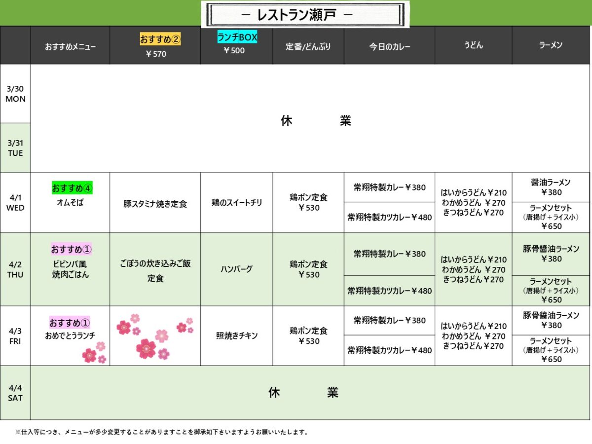 【広国大】呉: レストラン瀬戸 3月30日からの1週間メニュー