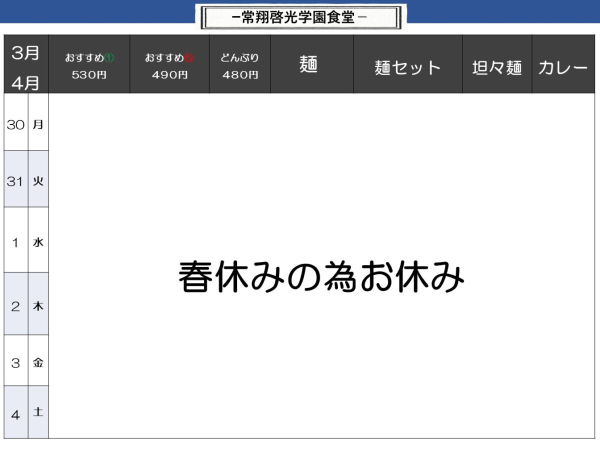 【常翔啓光中・高】啓光学園食堂 3月30日からの1週間メニュー