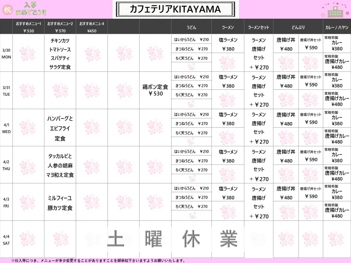 【工大】枚方:カフェテリアKITAYAMA 3月30日からの1週間メニュー