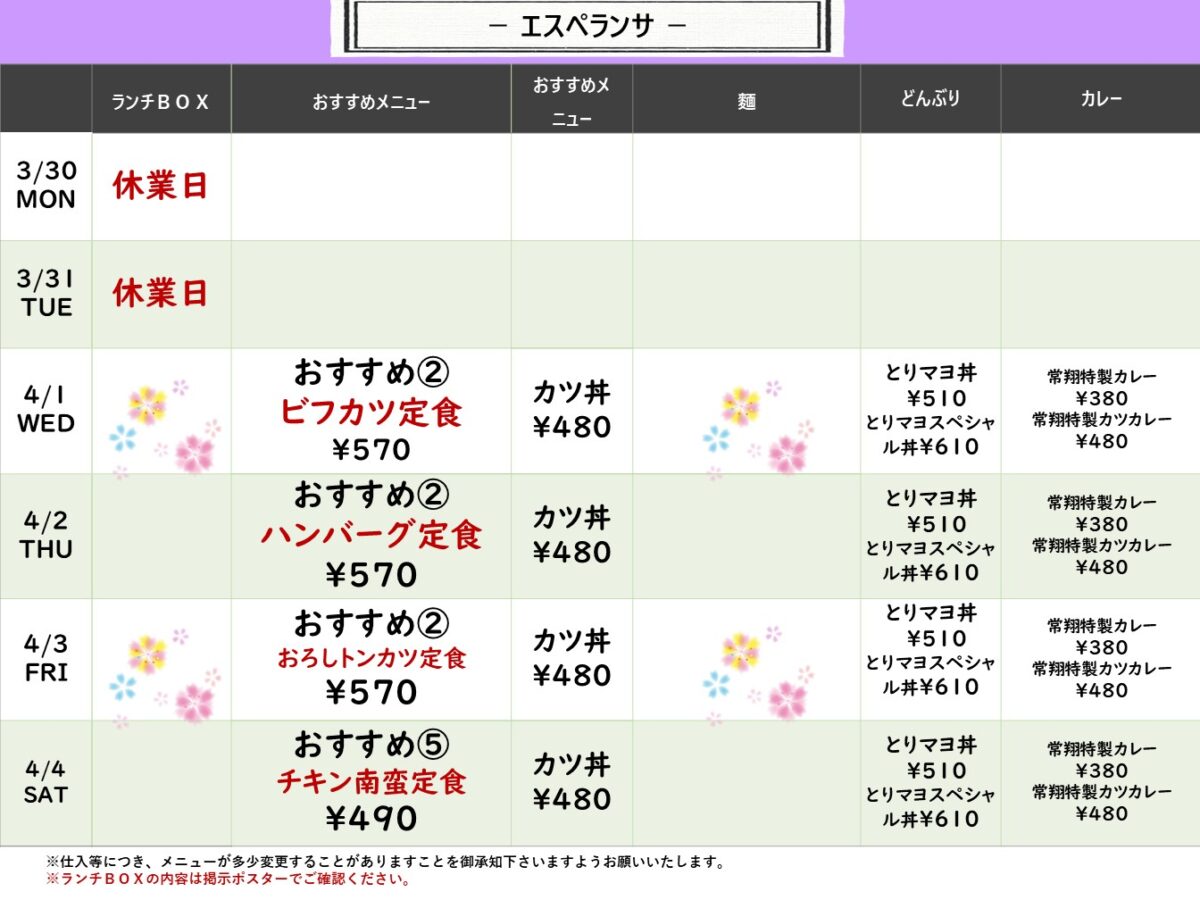 【常翔学園中・高】エスペランサ 3月30日からの1週間メニュー