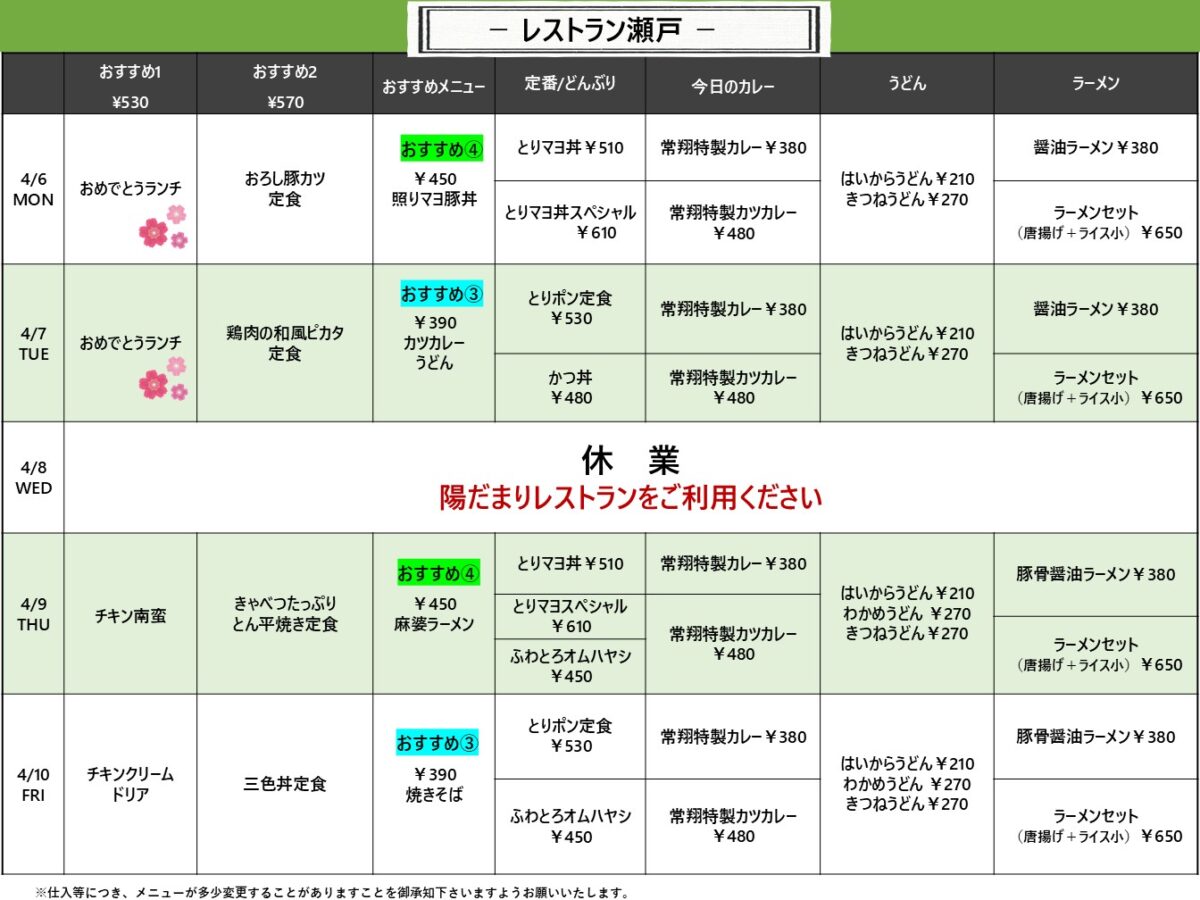 【広国大】呉: レストラン瀬戸 4月6日からの1週間メニュー
