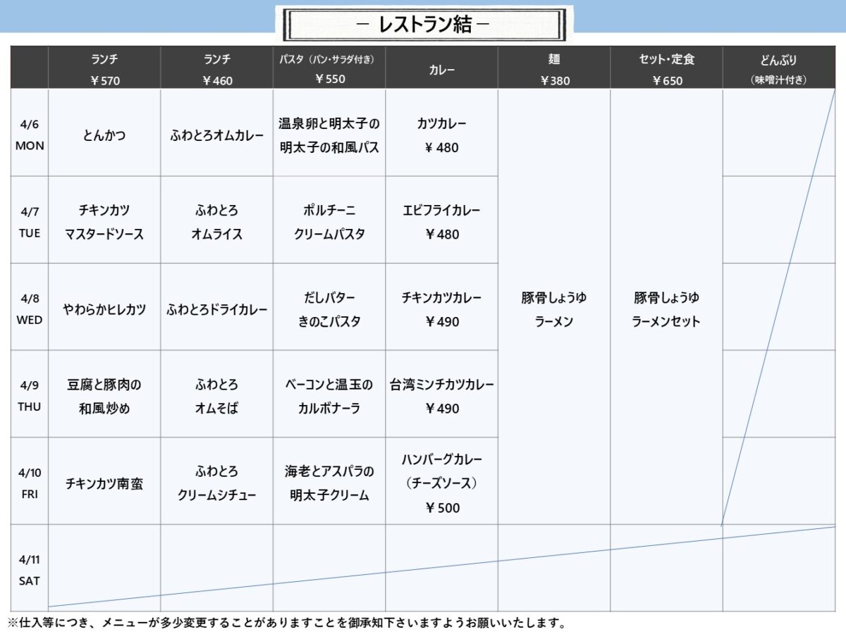 【摂南大】枚方:レストラン結 4月6日からの1週間メニュー