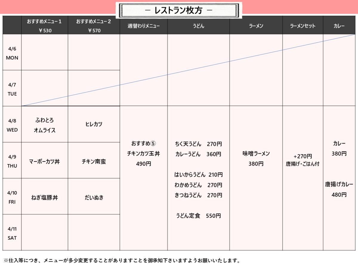 【摂南大】枚方:枚方食堂 4月6日からの1週間メニュー