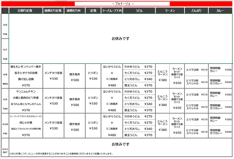 【摂南大】寝屋川:ブォナージョ 4月6日からの1週間メニュー