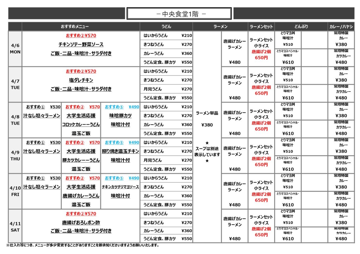 【大工大】大宮:中央食堂1階 4月6日からの1週間メニュー