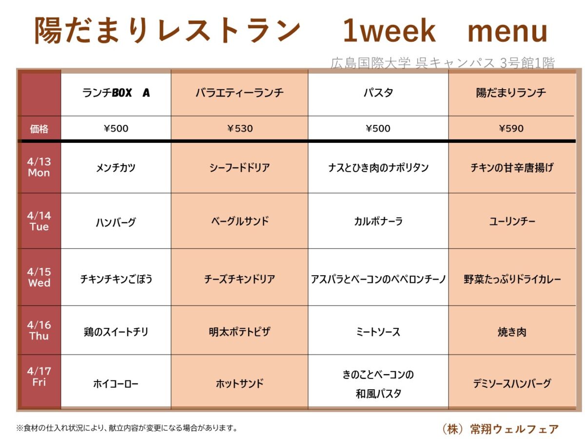 【広国大】呉: 陽だまりレストラン 4月13日からの1週間メニュー
