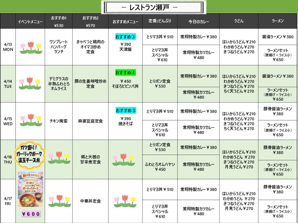 【広国大】呉: レストラン瀬戸 4月13日からの1週間メニュー