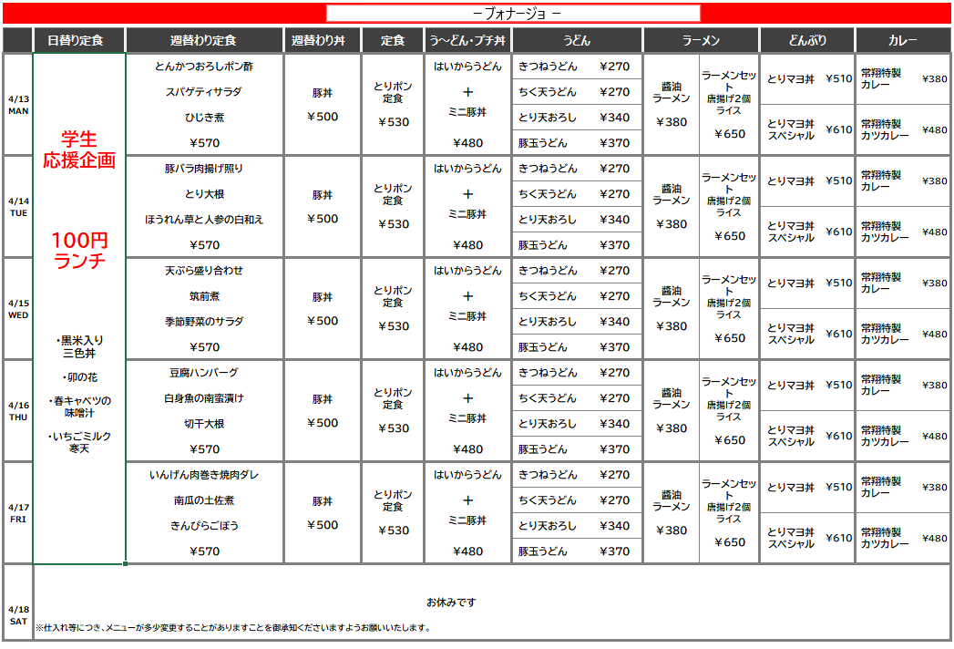 【摂南大】寝屋川:ブォナージョ 4月13日からの1週間メニュー