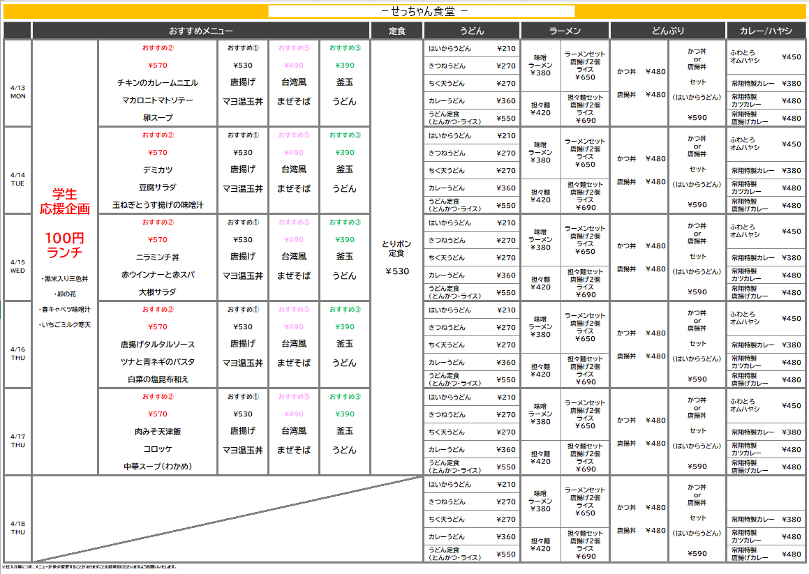 【摂南大】寝屋川:せっちゃん食堂 4月13日からの1週間メニュー