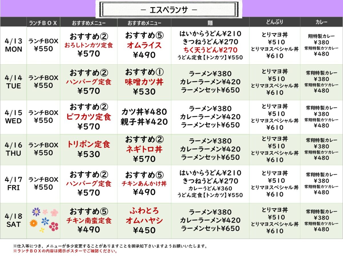 【常翔学園中・高】エスペランサ 4月13日からの1週間メニュー