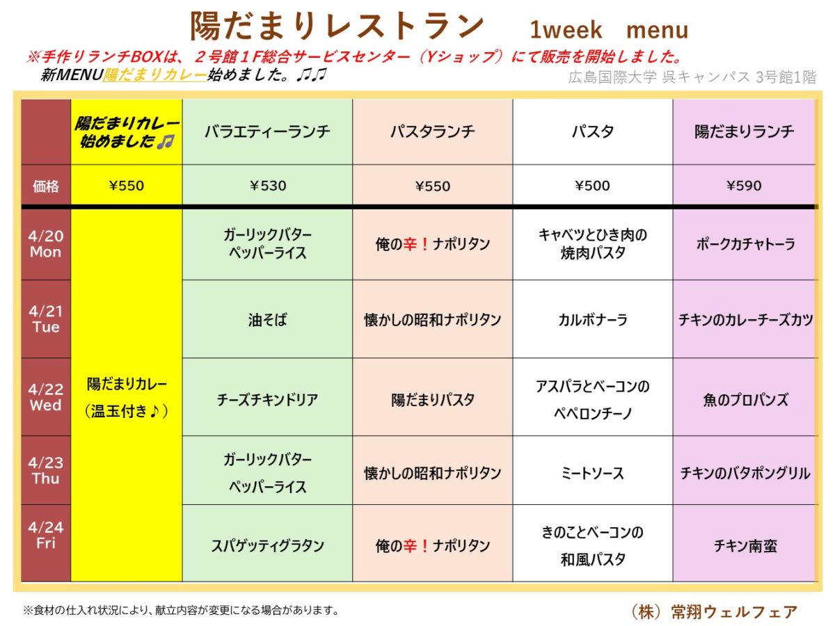 【広国大】呉: 陽だまりレストラン 4月20日からの1週間メニュー