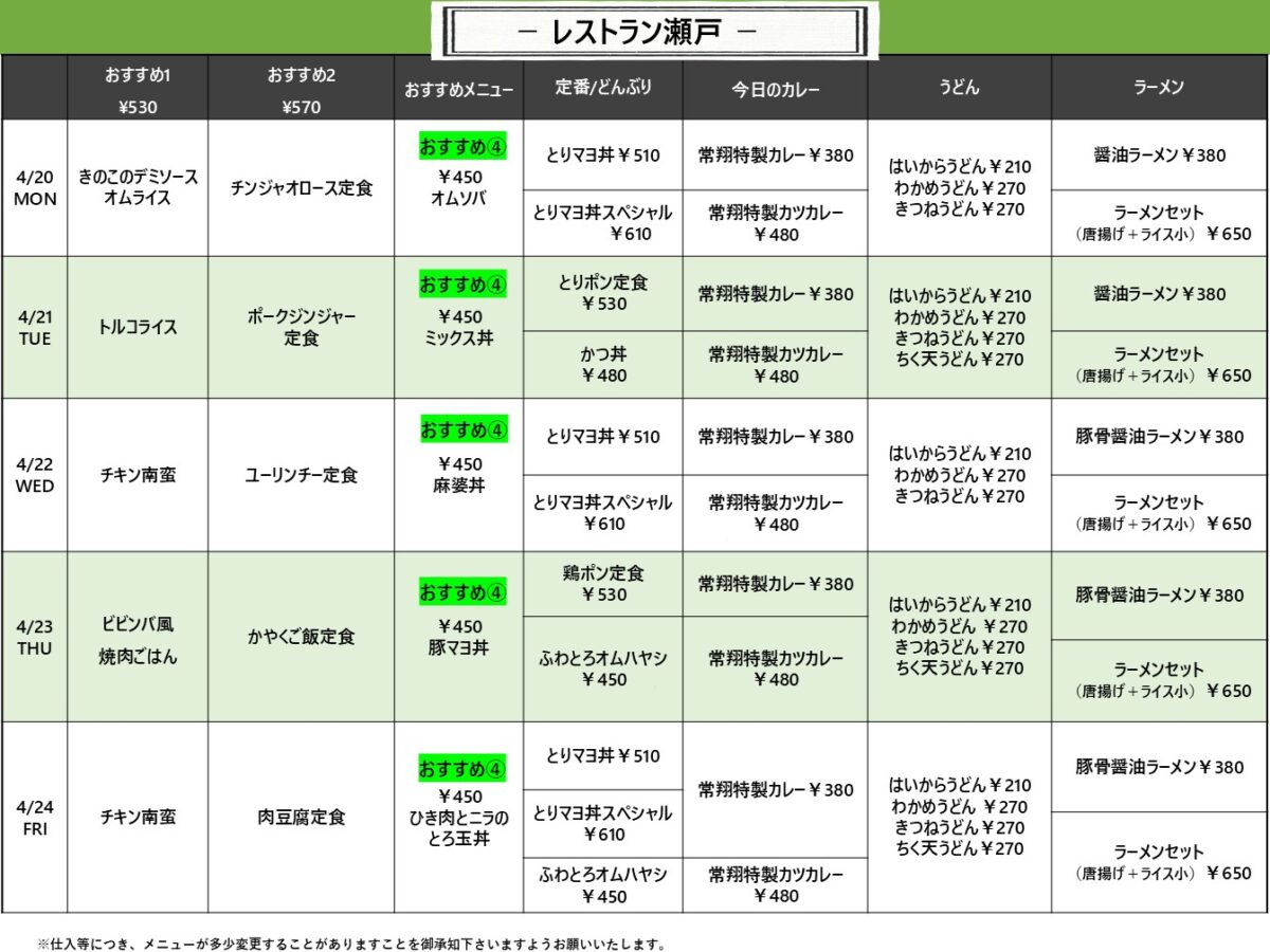 【広国大】呉: レストラン瀬戸 4月20日からの1週間メニュー