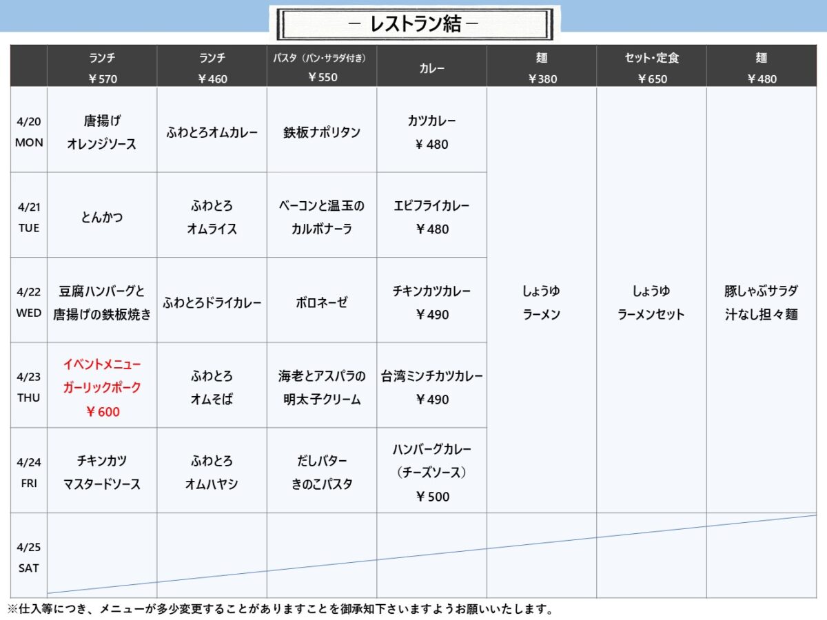 【摂南大】枚方:レストラン結 4月20日からの1週間メニュー