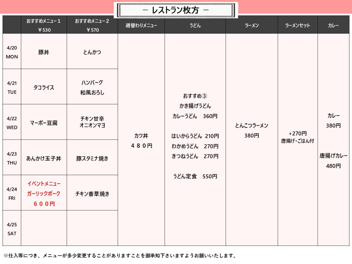 【摂南大】枚方:枚方食堂 4月20日からの1週間メニュー