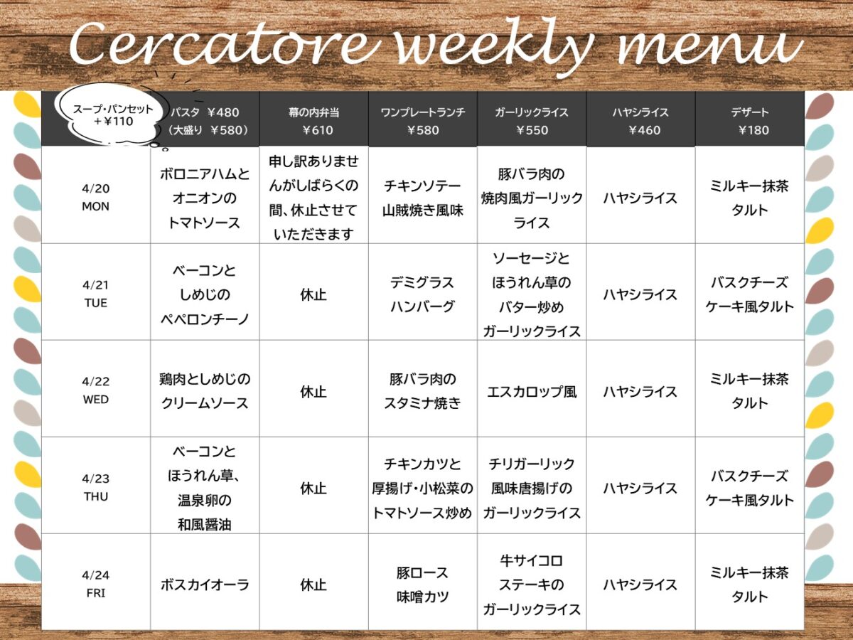 【大工大】大宮:チェルカトーレ 4月20日からの1週間メニュー