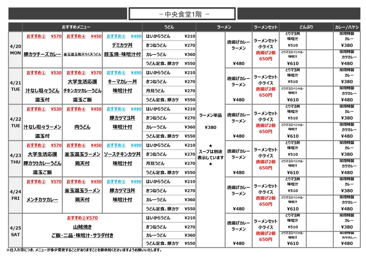 【大工大】大宮:中央食堂1階 4月20日からの1週間メニュー