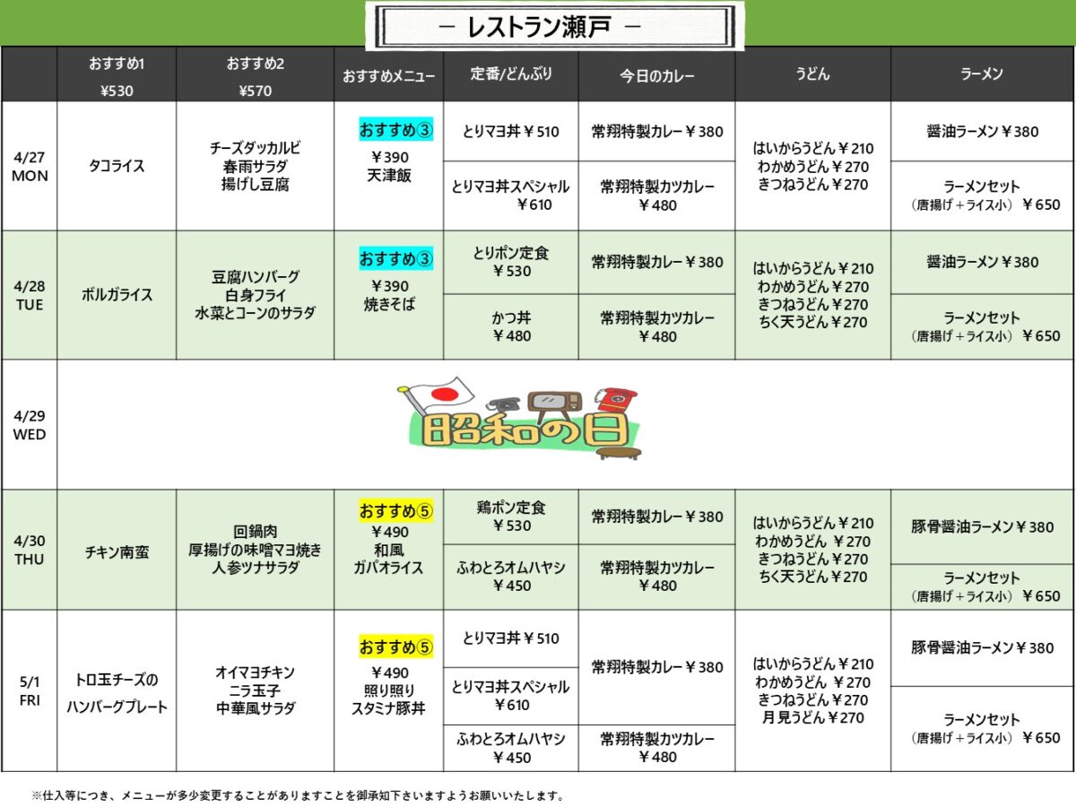 【広国大】呉: レストラン瀬戸 4月27日からの1週間メニュー