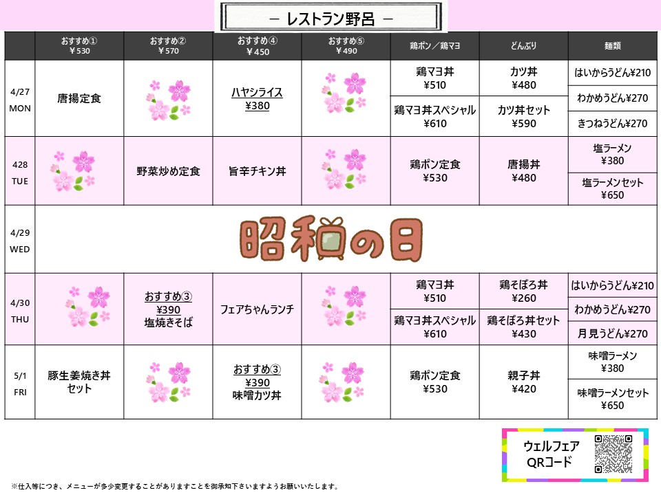 【広国大】東広島:レストラン野呂 4月27日からの1週間メニュー