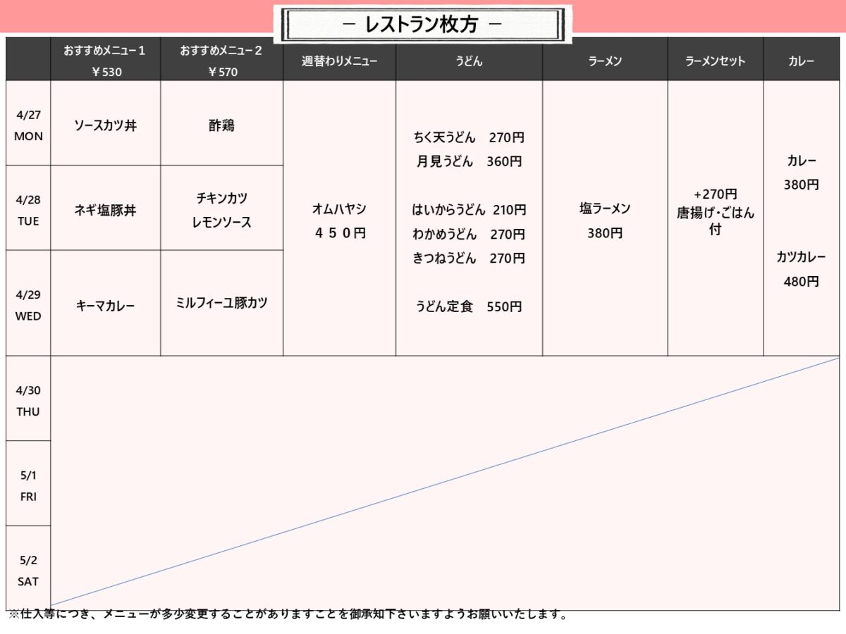 【摂南大】枚方:枚方食堂 4月27日からの1週間メニュー