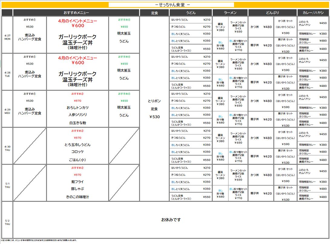【摂南大】寝屋川:せっちゃん食堂 4月27日からの1週間メニュー