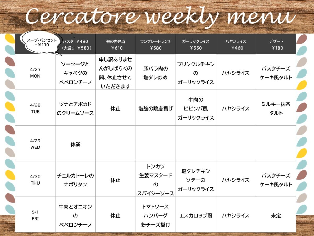【大工大】大宮:チェルカトーレ 4月27日からの1週間メニュー