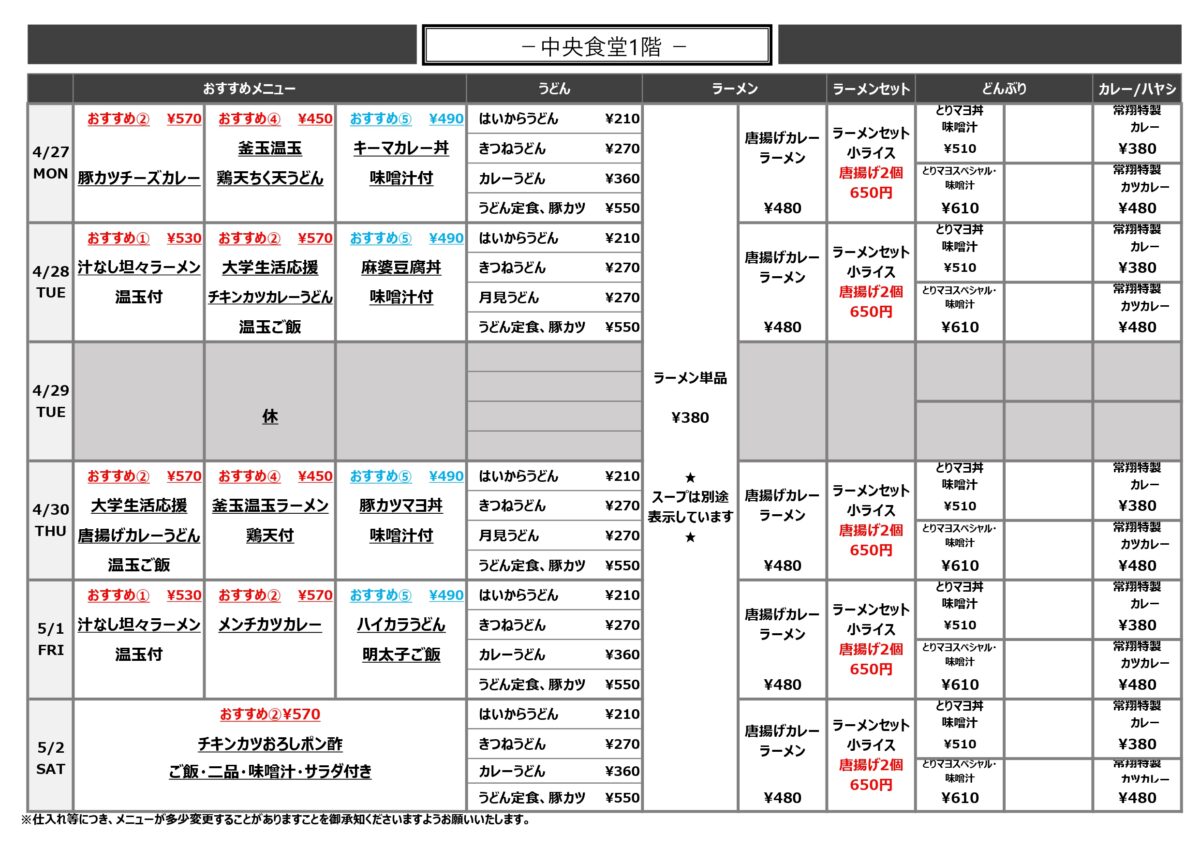 【大工大】大宮:中央食堂1階 4月27日からの1週間メニュー