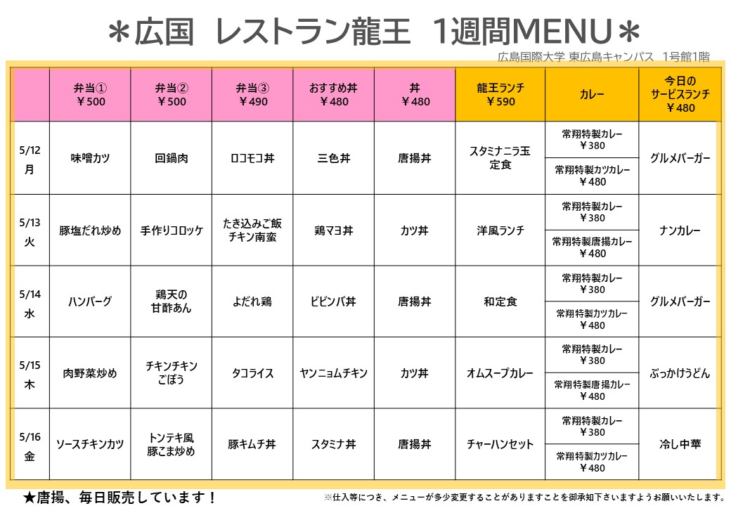 【広国大】東広島:レストラン龍王 5月12日からの1週間メニュー